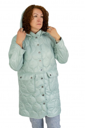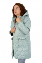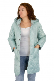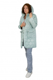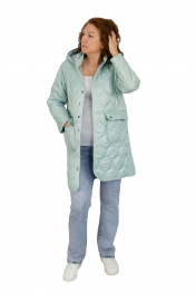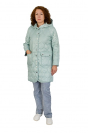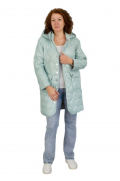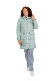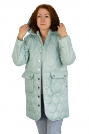 Куртка женская, утепленная с фигурной стежкой выполненная на весь пакет изделия, прямого силуэта, рукавами реглан. Воротником стойка с закруглёнными краями. Капюшон, который пристегивается на 5 кнопок, верхняя и нижняя часть с планкой и центральной частью. Нижний капюшон и планка капюшона без стежки. Перед с центральной застежкой на 9 кнопок, закругленным бортом. Подрезом по линии талии, в который входит клапан с закруглёнными краями и застежкой на 2 кнопки. Боковыми накладными карманами с закругленными по низу. В левом кармане вверху вставлена фирменная вшивка Swift. Рукава реглан, длинные, двухшовные.
