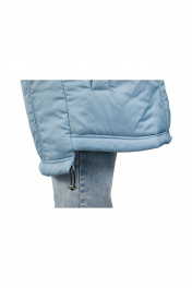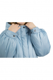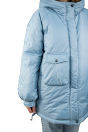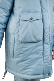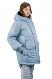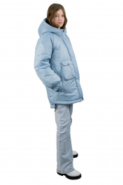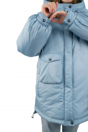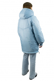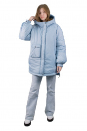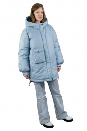Куртка женская, утеплённая в два слоя, прямого силуэта, втачным капюшоном, верхняя и нижняя часть которого с планкой и центральной частью. Рукавами типа реглан. Перед с центральной застежкой на тесьму-молнию, настрачной планкой на которой расположено 5 кнопок, верхняя и нижняя пробиты на сквозь, остальные 3 потайные. Боковые прорезные карманы с широкой листочкой. На правой части переда расположен накладной карман типа портфель с остроконечным клапаном, застегивающийся на 1 кнопку пробитой насквозь. Рукава типа реглан, одношовные, с выточной вверху, собран на манжету, которая застегивается одной кнопкой пробитой насквозь.