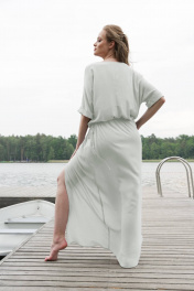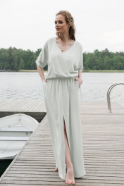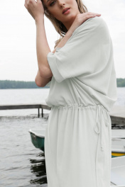 Платье свободного кроя с рукавом "летучая мышь" и манжетой. Линия талии отрезная на резинке с кулиской и шнуровкой, выходящей в боковые швы. Юбка с карманами в боковых швах и разрезом по переду. Длина платья во всех размерах 150 см. Длина рукава от края плеча 32 см. Длина изделия от линии талии до начала разреза по переду юбки 40 см