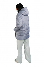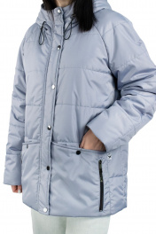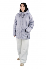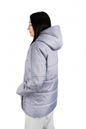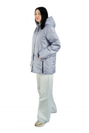 Куртка женская, утеплённая, прямого силуэта, втачным капюшоном, верхняя и нижняя часть которого с планкой и центральной частью прорезями для эластичного шнура с фиксаторами. Рукава типа реглан. Стёжка выполненана на автомате 6 строчек на расстоянии 11,5см. Перед с центральной застёжкой на тесьму-молнию, втачной планкой на которой расположено 6 кнопок, пробитых насквозь. Боковыми накладными карманами, со скошенным краем, застёгивающиеся на 1 кнопку, пробитые насквозь. Также на карманах расположены, функциональные прорезные карманы на молнии, с пуллером на бегунке. На левом кармане в шов настрачивания вверху, вставлена фирменная вшивка. Спинка цельная. Рукава типа реглан, двухшовные. Отделочная строчка 0,2 см вокруг прорезного кармана на молнии и по краю планки капюшона. По планке переда и верхнему краю накладного кармана 0,7см.