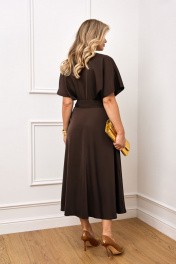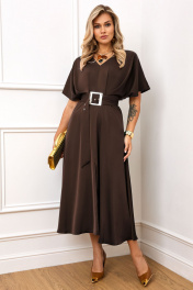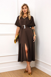 Элегантное нарядное платье, выполнено из роскошной струящейся плательной ткани с добавлением вискозы. Платье с V-образным вырезом горловины, отрезное по линии талии. Верхняя часть платья выполнена в свободном стиле со спущенной линией плеча и глубокими складками на линии талии, что придает платью особый стиль и шарм. Юбка платья с расклешением, по переду с разрезом. В боковом шве платья потайная молния застежка. Рукав цельнокроеный, объёмный, со спущенной линией плеча. В комплекте к платью идет съемный пояс с шикарной золотой пряжкой. Модель удобная и практичная, вы будете в нем выглядеть неотразимо и нарядно.
