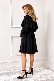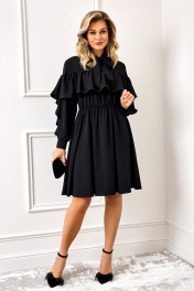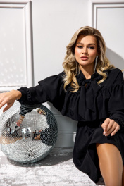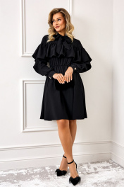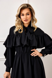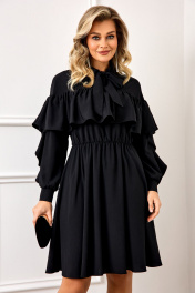 Эффектное и стильное платье, выполнено из мягкого креп-шифона. Платье полностью на трикотажной подкладке. Горловина стойка, которую можно завязать в бант, для придания модели особой нарядности. Платье А-силуэта, по талии на резинке. Спереди и по спинке с рюшей с небольшой сборкой, переходящей в рукав. Рукав полной длины, с манжетой и застежкой на металлическую пуговицу в виде бантика. Модель удобная и практичная, вы будете в нем выглядеть неотразимо и роскошно.