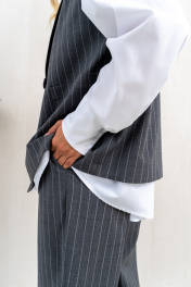 Жилет, брюки - полиэстер 73%, вискоза 25%, эластан 2%. Блузка- хлопок 63%, полиэстер -32%, эластан 5%