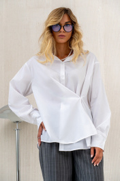 Комплект женский состоит из жилетки, блузки и брюк. Жилетка прямого силуэта с 2-х бортной застежкой, на подкладке. По переду накладные карманы. Брюки прямого силуэта со складками по переду и заутюженными стрелками. Для максимально комфортной посадки по бокам пояса вставлена эластичная резинка. Застёжка на молнию с гульфиком и пуговица по поясу. По переду в боковых швах карманы. Задние половинки брюк с талевыми вытачками. Блузка прямого силуэта с центральной застёжкой. Вырез горловины оформлен отложным воротником со стойкой. Спинка с кокеткой и встречной складкой. Рукав длинный с манжетой по низу. Застежка манжеты на 2-е петли и пуговицы. Блузку можно носить как обычная рубашка, так и с имитацией запаха .