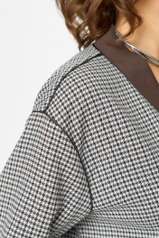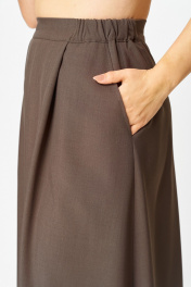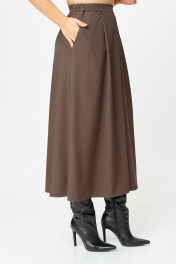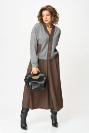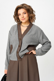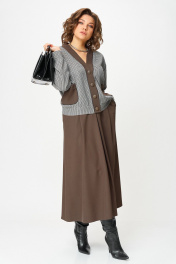 Этот костюм — воплощение интеллектуальной элегантности. Мягкий светло-серый кардиган с коричневыми кантами и крупными пуговицами создаёт образ уютного шарма. V-образный вырез визуально вытягивает шею, а контрастные детали подчёркивают чёткость линий. Рукав на спущенной плойме с манжетой по низу. По перду накладные карманы с декоративной нашивкой. Коричневая юбка миди с глубокими встречными складками и разрезом по переду добавляет образу женственности. В боковых швах карманы. Юбка на подкладке. Для максимально комфортной посадки по бокам пояса вставлена эластичная резинка. Сочетание мягкого верха и строгого низа создаёт баланс между комфортом и аккуратностью, делая комплект универсальным для офиса, повседневных выходов и стильных деловых встреч.