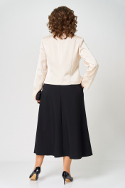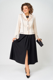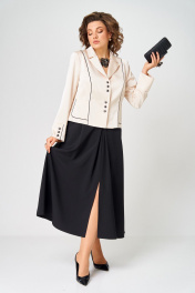 Образ излучает элегантность и утончённость, сочетая мягкую классику с лёгким акцентом на современность. Кремовый жакет подчёркивает свет лица и создаёт впечатление мягкого сияния, а тонкий контрастный кант формирует графичность и стройнит силуэт. Мягко приталенный крой и декоративные пуговицы придают наряду изысканный. Костюм полуприлегающего силуэта с фигурными рельефами от плеча проходят по переду, а контрастный тёмный кант по рельефам, борту, карманам и низу визуально стройнят. Рукав втачной двушовный с манжетой пот низу. Манжета декорирована пуговицами и кантом. Юбка с центральными складками и разрезом добавляет женственность.