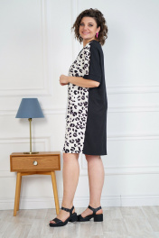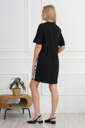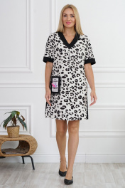 Платье женское прямого, свободного силуэта, с цельнокроеными короткими рукавами понизу с притачными манжетами. Вырез горловины V – образной формы с притачной планкой. Перед со средним швом и накладным боковым карманом по правой части декорированный по центру нашивкой и отделочной деталью по краям. Спинка со средним швом.