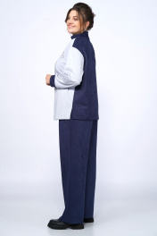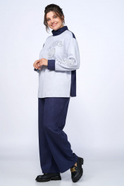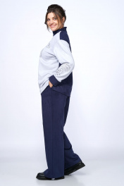 Блузон прямого, свободного силуэта, с застёжкой по среднему шву спинки на потайную молнию, со спущенной линией плеча. Перед с нагрудными выточками. Рукава втачные, одношовные, длинные, понизу с притачными манжетами. Воротник стойка. Декорирован вышивкой по переду и левому рукаву. Брюки широкие свободные прямого силуэта, на притачном поясе по боковым на резинке, застёжка типа «гульфик» на молнию и петлю, пуговицу по поясу. Передние части с талевыми выточками и боковыми карманами. Задние части с талевыми выточками.