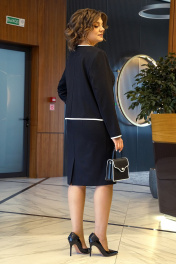 Жакет прямого силуэта, с застёжкой встык с завязками. Перед с нагрудными выточками. Спинка со средним швом. Рукава втачные, двухшовные. Срезы обработаны окантовочным швом. Платье полуприлегающего силуэта, с застёжкой на потайную молнию в среднем шве спинки. Перед с нагрудными и талевыми выточками. Спинка с талевыми выточками и шлицей.