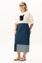 Предлагаем Вам комплект, состоящий из блузки и джинсовой юбки. Блузка из тонкой и легкой ткани из хлопока с добавлением эластана, идеально подойдет для жаркого летнего дня, так как отлично пропускает воздух. Эта блузка с печатью в виде собаки станет отличным дополнением к вашему гардеробу, подчеркнет ваш индивидуальный стиль и добавит нотку стильной элегантности. Джинсовая юбка-предмет одежды на все времена,это базовая вещь в гардеробе, которая отлично сочетается с разными стилями и подходит для любого возраста. Эта юбка — воплощение интеллектуального кэжуала. Выполнена из высококачественного джинса - очень приятна к телу. Главные особенности модели: двухцветный дизайн с контрастным светлым подолом, который визуально облегчает силуэт, притачной пояс со шлевками, функциональные накладные карманы и оригинальная застежка-гульфик, смещенная в сторону. Асимметричная планка с пуговицами и смещенная вправо застежка добавляют образу динамики и делают привычный деним ультрамодным. Комплект уникален в том, что и блузку и юбку можно сочетать с другими элементами из Вашего гардероба. Благодаря разнообразию вариантов комбинирования, вы будете выглядеть модно и стильно в любой ситуации. Идеально для тех, кто ценит комфорт без потери стиля - выглядеть модно, но при этом быть свободными в движениях. Комплект предназначен для создания разных силуэтов и позволяет экспериментировать с образами. Отлично подходит для работы, прогулок или вечернего выхода. Идеальный выбор для тех, кто ищет базу с характером. Длина рукава - 52 Длина блузы - 64 Длина юбки - 89