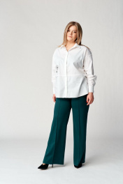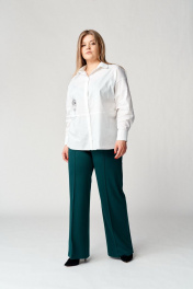 Стильные широкие брюки с высокой талией из трикотажного полотна средней плотности. Брюки на притачном поясе с резинкой. По переду карманы с наклонной линией входа. Застроченные стрелки спереди, красиво удлиняют силуэт. Длина брюк по боковому шву без пояса 107 см.