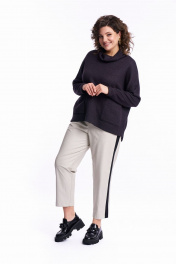 Брюки классической формы, укороченные и чуть зауженные к низу, на притачном поясе, выполнены из экокожи. По переду и спинке брюк застрочены стрелки и имеются талиевые вытачки. В боковом шве расположен лампас, выполненный из отделочной ткани. Застёжка – имитация гульфика спереди. В пояс вставлена эластичная резинка, для удобства посадки на разные фигуры и шнур для дополнительной фиксации. Брюки удобные, не сковывают движения, могут подойти, как для повседневной носки, прогулок, так и для работы в офисе и школах. Длина брюк по боковому шву с поясом 97 см.