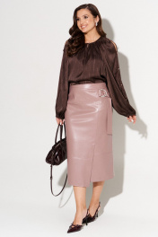Юбка из экокожи, длиной миди (78 см для 46 р-ра). Застегивается изделие на потайную тесьму-молнию в боковом шве, без подкладки. По переду имитация запаха с декоративной пряжкой и поясом.