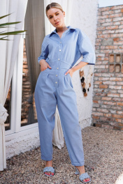 Комбинезон свободного силуэта из джинсовой ткани,отрезной по линии талии.По переду застежка на кнопках.