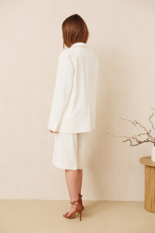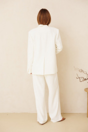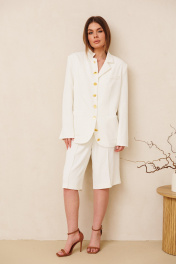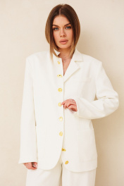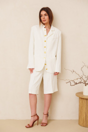 Классический жакет полуприлегающего силуэта.По переду жакета действующие карманы.застежка на три основных петли-пуговицы(остальные пуговицы выполнены в качестве декора) Воротник жакета ассиметричный.На рукавах и спинке отлетная шлица.Изделие на подкладке