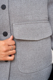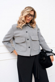 Жакет женский из плотной костюмной ткани на подкладке, прямого силуэта с центральной бортовой застёжкой на петли и пуговицы. Линя плеча слегка спущена, рукав втачной двухшовный. Спинка цельнокроеная. На полочке настрочен накладной карман с клапаном. Воротник отложной.