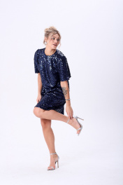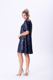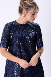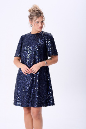 Платье из ткани в пайетки А-силуэта, длинной чуть ниже колена. Вырез горловины круглый по спинке для удобства обработана капелька, застегивающаяся на петлю и пуговицу, спинка со средним швом. Рукав короткий слегка расширенный к низу.