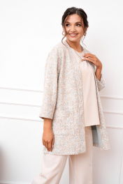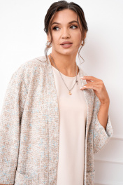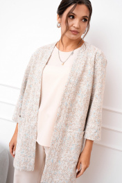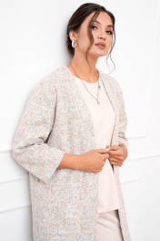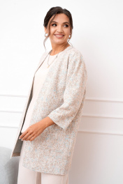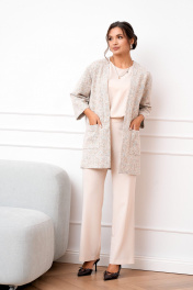 Костюм женский тройка, состоящий из облегчённого жакета, блузки и брюк. Жакет удлинённый выполнен из трикотажа букле прямого силуэта, линия плеча слега спущена, рукав длинной 7/8. Застежка центральная на притачных планках, по полочке в области бёдер обработаны накладные карманы. Брюки прямого силуэта с центральной застёжкой на тесьму молнию и петлю, и пуговицу. Верхний срез брюк обработан притачным поясом по талии с эластичной тесьмой для лучшей посадки и шлёвками для ремня. Блузка полуприлегающего силуэта без рукавов со слегка спущенной линией плеча, вырез горловины круглый по спинке для удобства обработана капелька, застёгивающаяся на петлю и пуговицу. Низ по боковым швам закруглённый переходящий в небольшие разрезы.
