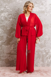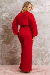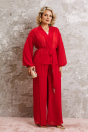 В женском костюме из шифотновой ткани вы будете в центре внимания на любом мероприятии. Легкий материал приятно облегает тело, создавая ощущение комфорта в любое время года. Широкий размерный ряд позволяет каждому найти идеальный вариант, подчеркивающий Вашу индивидуальность, и скроет возможные недостатки в больших размерах. Блузка прямого силуэта из шифона жатка со пущенной линией плеча. Рукав двойной, расширенный к низу со складками. По спинке и полочке идет планка. В комплекте с блузкой идет съемный пояс. Брюки прямые на трикотажной подкладке масло, с запахом по переду, пояс на резинке. Длина блузки: (48-56)-61см. Длина рукава-52см. Длина брюк:(48-54)-105см., (56)-108см.