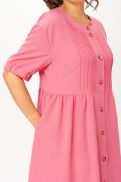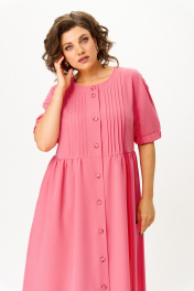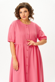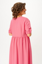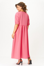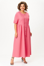 Платье свободного силуэта, длиной макси, выполнено из однотонной ткани. Платье с отрезным лифом и с центральной застежкой на петли и пуговицы. Полочка лифа с нагрудными вытачками и вертикальными защипами, горловина круглой формы с притачной планкой. Спинка с талиевыми вытачками. Пройма углубленной формы. Рукав рубашечного типа, одношовный, длиной до локтя. По низу рукава обработана притачная манжета с эластичной тесьмой. Юбка платья с вертикальными рельефами по передней и задней частям, со сборкой по шву притачивания к лифу. В боковых швах обработаны прорезные карманы.