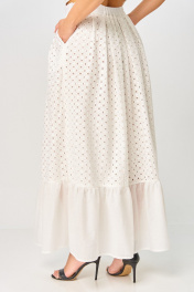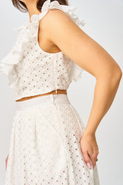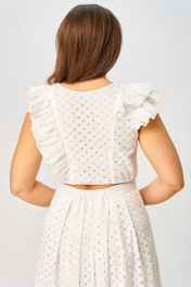 Костюм состоящий из топа и юбки, выполнен из хлопчатобумажной, однотонной ткани “ришелье”. В качестве отделки и подкладки использована однотонная гладкая ткань. Топ прилегающего силуэта, на подкладке. Полочка топа с рельефами и горловиной овальной формы. Спинка топа с вертикальными рельефами. В рельефе с левой стороны обработан волан от низа полки через плечо до низа спинки, в рельефе с правой стороны обработан короткий волан. Воланы топа выполнены из однотонной гладкой ткани. Правая пройма топа по окату обработана воланом. Застежка на потайную молнию в левом боковом шве. Юбка длиной макси на подкладке, с бантовыми складками по талии и наклонными карманами по передним половинкам. В левом боковом шве обработана потайная молния. По талии юбка на притачном поясе с эластичной тесьмой по задней части пояса и застежкой на петлю и пуговицу с левой стороны. Низ юбки обработан притачным воланом из однотонной гладкой ткани.