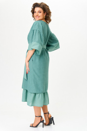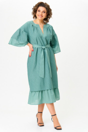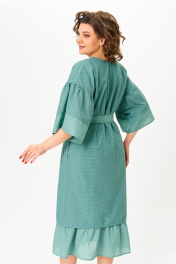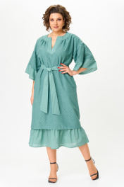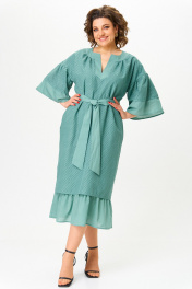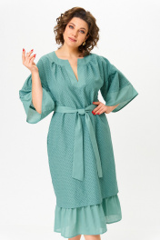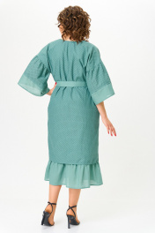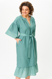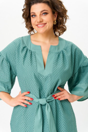 Платье прямого, свободного силуэта, выполнено из однотонной ткани “ришелье“, в качестве отделки использована однотонная гладкая ткань. Платье на подкладке. Полочка платья цельная, горловина круглой формы, обработана притачной планкой из однотонной ткани. Спинка цельная. Пройма платья углубленной формы с удлиненной линией плеча. Рукав в виде волана со сборкой. Низ рукава оформлен притачной планкой из однотонной гладкой ткани. По боковым швам в области талии обработаны шлевки, через которые продет пояс, завязывающийся спереди. Низ платья оформлен воланом со сборкой из однотонной гладкой ткани, притачаным к подкладке.