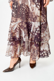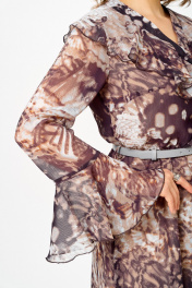 Платье длиной макси, свободного силуэта. Платье выполнено из шифона с набивным рисунком, лиф и юбка платья на подкладке. Платье отрезное по линии талии. Полочка лифа с нагрудными вытачками и центральной планкой с застежкой на петли и пуговицы. Горловина V-образной формы, обработана воротником в виде рюши. Спинка лифа цельная. Рукав длинный, втачной, одношовный, низ рукава обработан притачным воланом. Юбка обьемная со складками по талии и на резинке. Низ юбки с притачным двойным воланом. Платье по талии с готовым поясом.