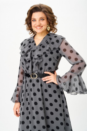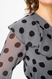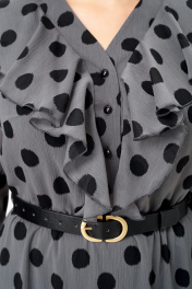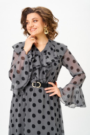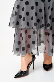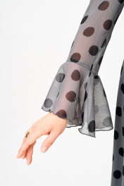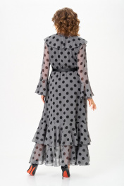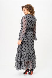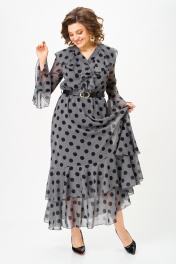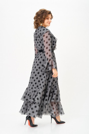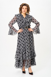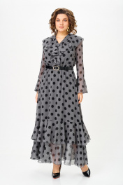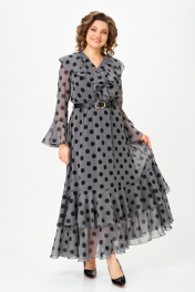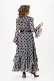 Платье длиной макси, свободного силуэта. Платье выполнено из шифона с набивным рисунком, лиф и юбка платья на подкладке. Платье отрезное по линии талии. Полочка лифа с нагрудными вытачками и центральной планкой с застежкой на петли и пуговицы. Горловина V-образной формы, обработана воротником в виде рюши. Спинка лифа цельная. Рукав длинный, втачной, одношовный, низ рукава обработан притачным воланом. Юбка обьемная со складками по талии и на резинке. Низ юбки с притачным двойным воланом. Платье по талии с готовым поясом.
