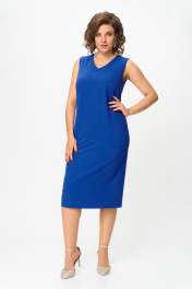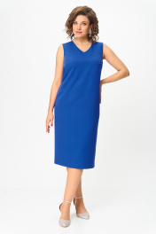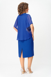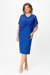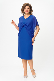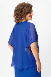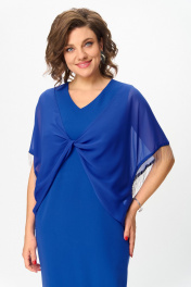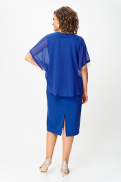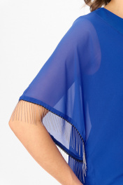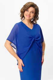 Платье полуприлегающего силуэта, двухслойное выполнено из однотонной ткани, в качестве отделки использован шифон. Платье длиной за колено. Полочка платья с нагрудными вытачками. Горловина полочки V-образной формы. Спинка платья со средним швом, в верхней части которого обработана потайная молния, в нижней части разрез. Платье без рукавов. Верхняя часть платья сьемная, выполнена из шифона. Полочка с конструктивным элементом в виде узла и V-образной горловиной. Спинка цельная. Линия плеча удлененная, образующая цельнокроеный рукав, длиной до локтя. Пройма обработана декоративной тесьмой.