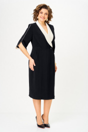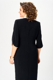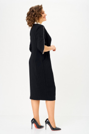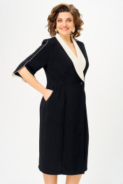 Платье полуприлегающего силуэта, длиной за колено, выполнено из однотонной ткани, в качестве отделки использована контрастная по цвету ткань с легким атласным эффектом. Полочка платья с вертикальными рельефами в верхней части и с отрезной боковой нижней частью, на которой выполнены карманы и складки в шве по талии. Застежка двубортная, на петлю и пуговицу. Горловина V-образной формы, обработана воротником типа “апаш” из отделочной ткани. Спинка со средним швом и вертикальными рельефами. Рукав длинной 3/4, втачной, двухшовный, с отделкой по краю.