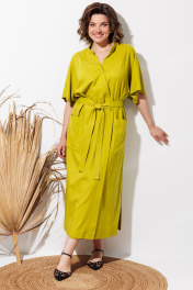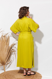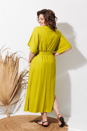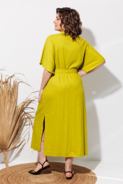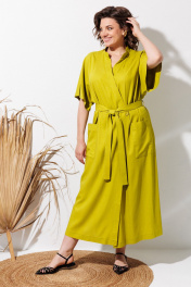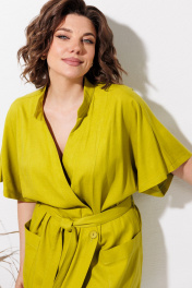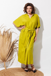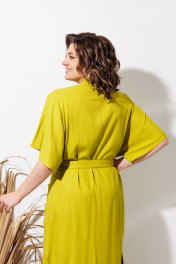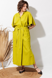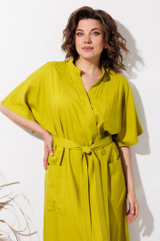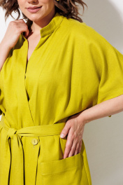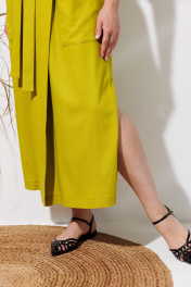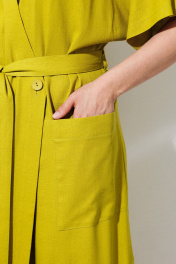 Платье прямого, свободного силуэта выполнено из однотонной ткани. Полочка платья двубортная, с застежкой на петлю и пуговицу, с внутренней стороны левая полочка крепится на хлястик и пуговицу.Горловина V-образной формы, с воротником-стойкой. В области бедер на полочке обработаны накладные карманы. Спинка со средним швом. Рукав платья цельнокроеный, свободный, длиной до локтя.