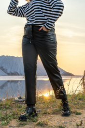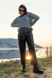 Эти стильные женские брюки в черном цвете идеально сочетают в себе комфорт и современный дизайн. Брюки выполнены в свободном покрое, обеспечивая идеальное чувство удобства на протяжении всего дня. Они оснащены удобным поясом на резинке с декоративным шнуром, что добавляет их внешнему виду оригинальности. Боковые карманы на передних половинках и настрочные карманы на задней части не только функциональны, но и вписываются в общий дизайн модели. Отделочные строчки по всей длине брюк придают изделию законченный и аккуратный вид, делая акцент на качестве исполнения. Незаменимый элемент гардероба для создания разнообразных образов, от деловых до повседневных.