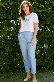 Брюки женские свободного кроя, на притачном поясе с эластичной тесьмой сзади, с застежкой на тесьму молнию и петлю/ пуговицу по поясу. Передние половинки с двумя наклонными боковыми карманами. Задние половинки с накладными карманами.