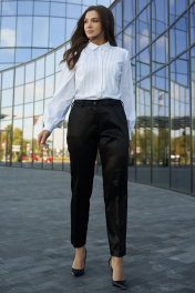 Брюки женские классические полуприлегающего силуэта с боковыми карманами спереди. Застежка брюк на тесьму молнию спереди и петлю и пуговицу по поясу. Пояс с эластичной резинкой сзади.
