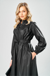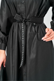 Платье миди Х-силуэта из эластичного хлопка. От плечевых швов заложены складки. По талии сзади и спереди платье присобрано на широкие планки в которые вдет пояс с декоративной тесьмой, формирующий женственные пропорции. Сквозная застежка на пуговицы зрительно вытягивает силуэт. Воротник-стойка. Классические манжеты на рукавах. Длина изделия - 126 см. Длина рукава -60 см.