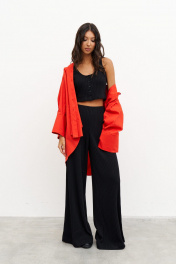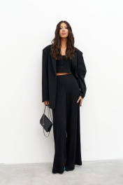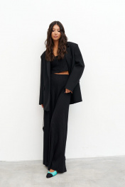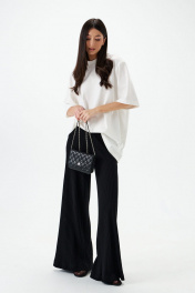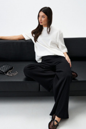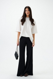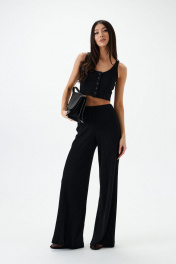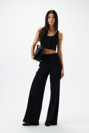 Брюки прямого кроя выполнены из трикотажного полотна узорной вязки черного цвета. Характеристики: прямой крой, пояс на резинке на подгибе. Длина 110 см. Образ дополнит топ, артикул А971.