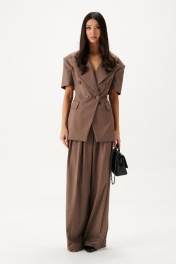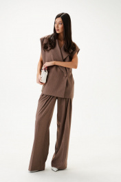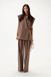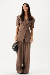 Брюки прямого свободного кроя. Выполнены из костюмной ткани цвета капучино в тонкую полоску. Прямой свободный крой, пояс стабильный, по поясу нашиты шлевки. По передней части защипы. В боковых швах карманы. Заутюженные стрелки по передней и задней частям изделия. Длина 112 см