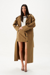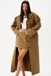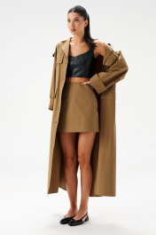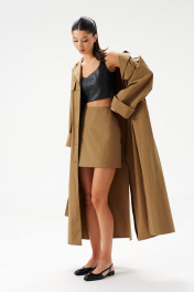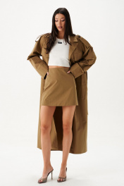 Юбка-мини. Выполнена из хлопковой ткани в цвете хаки. Силуэт - трапеция, стабильный пояс, есть подкладка. Застежка - молния в среднем шве заднего полотна изделия. Длина 41 см