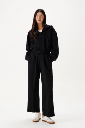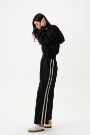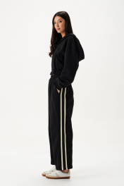 Брюки выполнены из трикотажного полотна черного цвета. Брюки свободного кроя, пояс брюк на резинке, в боковых швах карманы. По боковым швам изделия встрочен декоротивный элемент в виде лампасов. Длина по боковому шву 96 см.