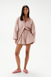 Шорты выполненные из текстильного жжатого полотна песочного цвета в розовую полоску. Характеристики: широкие, короткие, пояс притачной, присборен на резинку. Имеет две отделочные строчки по краям, образующие кулису, в которую продет шнур-завязка. В боковых швах карманы с отрезным бочком. Низ обработан в подгибку с закрытым срезом. длина 32 см