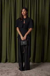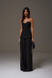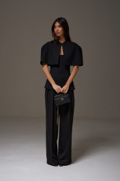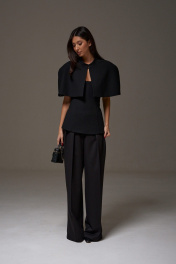 Брюки прямого кроя выполнены из ткани черного цвета.Характеристики: прямой крой, эластичная брендированная резинка, боковые карманы, на передней и задней частях брюк застрочены складки и заутюжены стрелки. Длина брюк 112 см