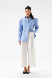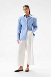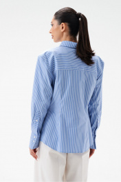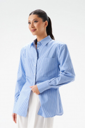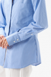 Блузка полуприталенного силуэта, выполнена из хлопкового голубого полотна в вертикальную полоску. Характеристики: воротник рубашечного типа, плечики, застежка центральная на петли пуговички, рукав втачной, по низу рукава манжета на пуговичках, по переду нашиты крупные карманы, низ изделия с плавным срезом. Спинка отрезная, две выточки. Длина изделия по спинке 72см, длина рукава от края горловины 78см