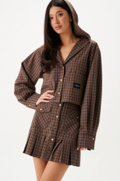 Рубашка прямого укороченного кроя. Характеристики: капюшон, застёжка центральная, длина укороченная, рукав свободный спущенный с широкой манжетой, по переду слева накладной карман с нашивкой. Длина рукава от горловины 79 см. Длина спинки от края горловины 45 см.