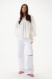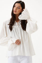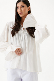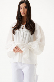 Блуза свободного кроя. Выполнена из хлопкового полотна. По переду и по задней части фигурная кокетка. По переду на кокетке тесьма-завязки (завязки функциональные). Рукав втачной, немного спущен. Низ рукава с резинкой и рюшей. Длина рукава 73 см. Длина спинки 65 см