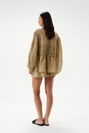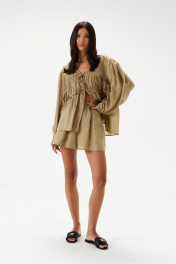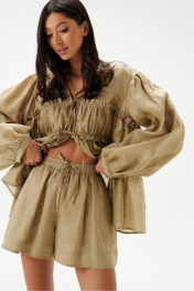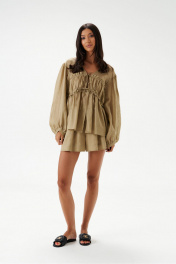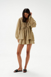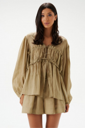 Блузка свободного кроя, выполнена из легкого натурального полотна. Прямой свободный крой, рукав широкий вточной, низ присборен на фигурную узкую манжету, V-образный вырез, лиф отрезной по линии талии, застежка центральная на шнурки-завязки. Длина по спинке 64 см, длина рукава от края горловины 68 см.