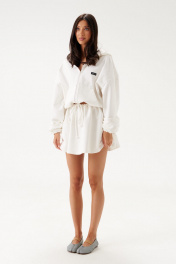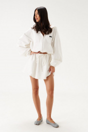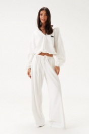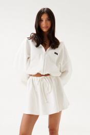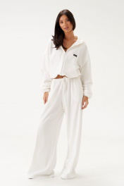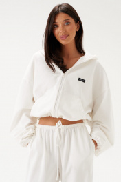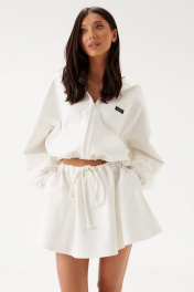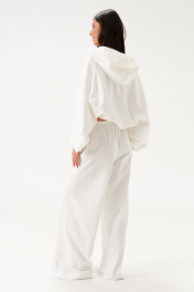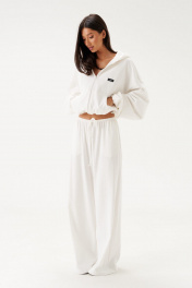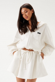 Джемпер прямого свободного кроя выполне из трикотажного полотна белого цвета. Характеристики: прямой крой, капюшон, застежка центральная -молния, рукав втачной на резинке, немного спущен, по низу изделие собирается на резинку с фиксаторами, по переду изделия крупные карманы. Длина рукава 60см, длина по спинке 60см.