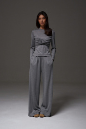 Джемпер прилегающего силуэта, выполнен из трикотажного полотна серого цвета. Характеристики: прилегающий силуэт, овальная горловина, рукав втачной, по переду изделия декоративный узел. Длина от края горловины 56 см, длина рукава от края горловины 77 см.