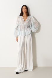 Блузка свободного кроя выполнена из полупрозрачной ткани с вышивкой голубого цвета. Характеристики: вырез V-образный, отрез по линии груди с двумя воланами, кокетка со сборкой, рукав вточной широкий, манжет на на резинке, застёжка на воздушные петли. Длина по центру спинк 59 см, длина рукава от края горловины 76 см.