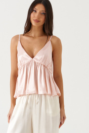 Топ свободного кроя с акцентным лифом, выполнен из мягкой струящейся ткани розового цвета. Характеристика: V-образный вырез декольте, на регулируемых бретелях, лиф двойной, с фигурным отрезом. Длина по боковому шву (с учётом лифа) 33 см.