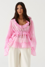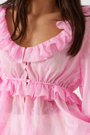 Блузка силуэта трапеция, выполнена из полупрозрачного полотна розового цвета с вышивкой. Характеристики: горловина круглая с отложной рюшей, рукав втачной, слегка спущен. По верху рукава сборка, по низу притачная рюша. Чуть выше линии талии блузка присборена на резинку. Застежка центральная, по верхней части лифа, на навесные петли - пуговицы.По низу блузки притачная рюша. Длина рукава от линии втачивания ( с учетом рюши) - 70 см, длина изделия по спинке 63 см